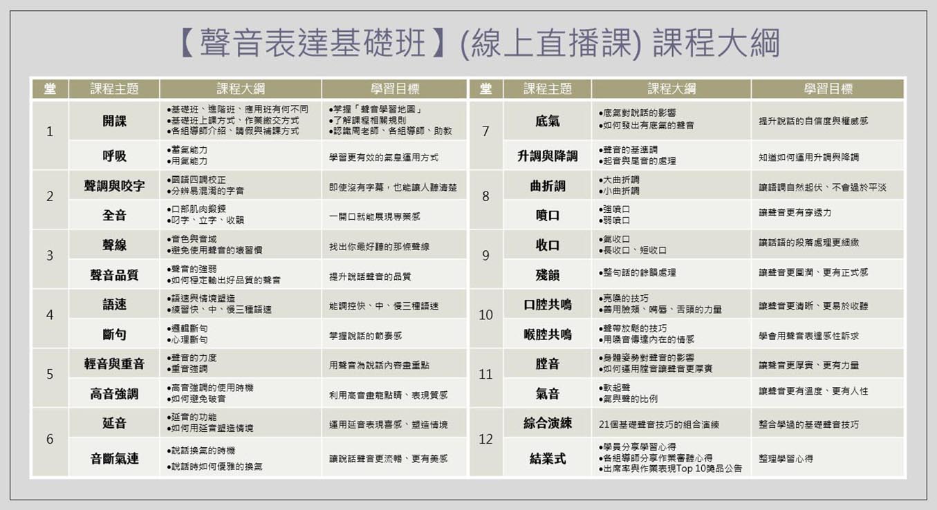 特別整理出來,設計成一套完整的帶狀課程,引導學員認識自己的聲音、演練每一個技巧,