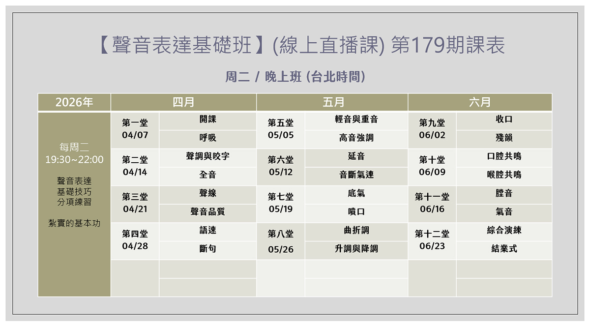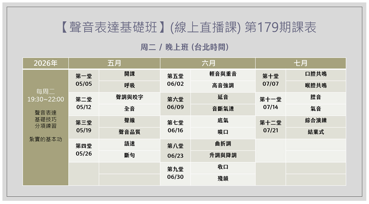 特別整理出來,設計成一套完整的帶狀課程,引導學員認識自己的聲音、演練每一個技巧,